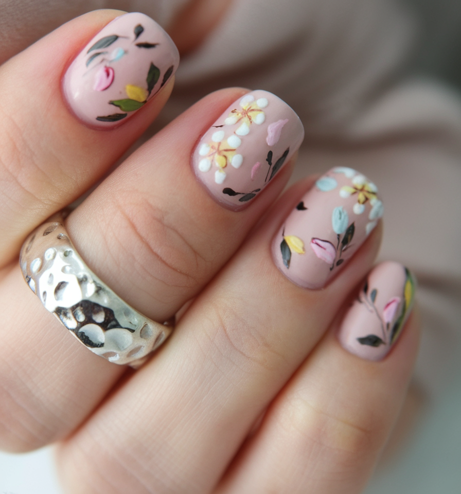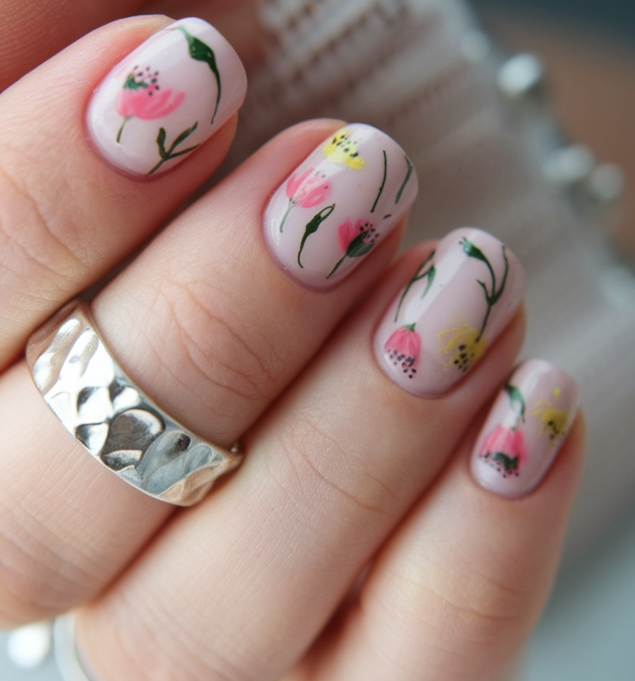 #21 Short Pastel Nails with Delicate Wildflower Art
