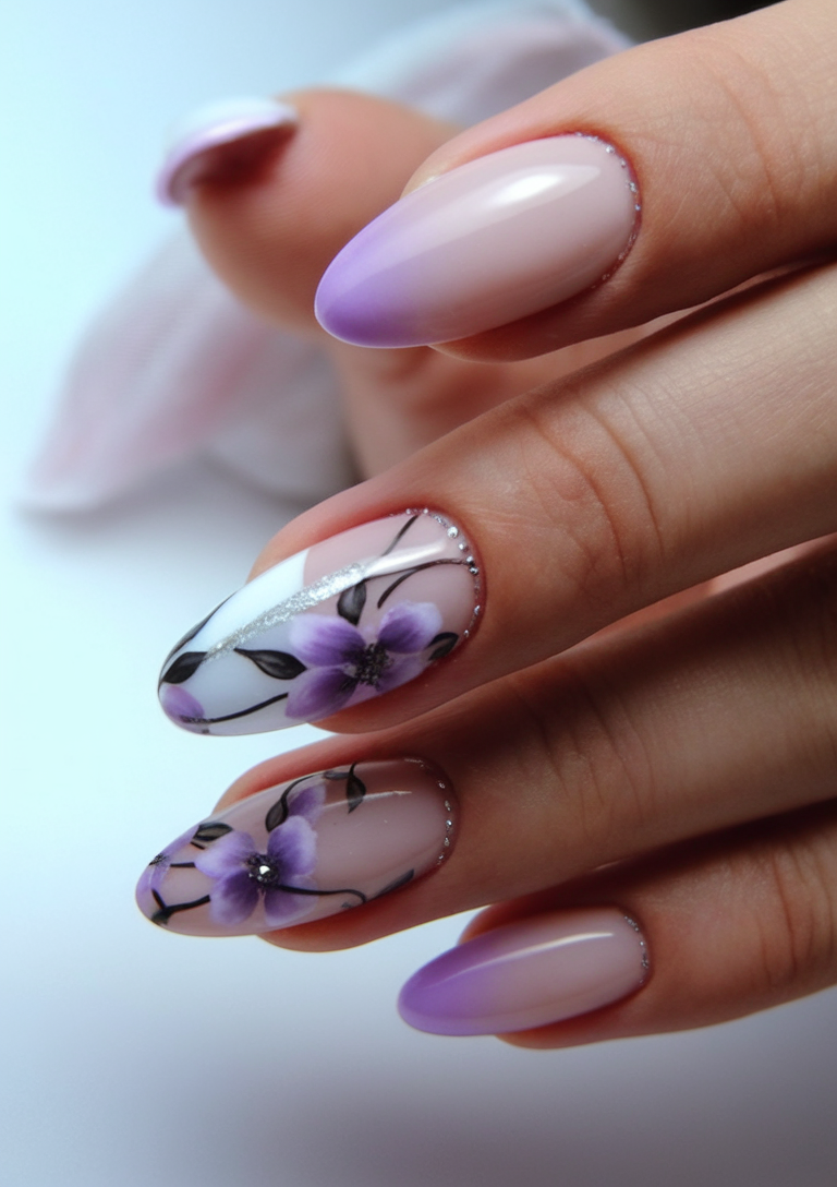A modern French tip twist, this classy almond-shaped set features a smooth gradient of purple fading into a sheer base. The detailed art purple flowers add dimension, with black stems enhancing the contrast. A touch of silver glitter lines the floral elements, making this design perfect for 2025 trends. The acrylic finish keeps the look sleek, making it a great choice for those who love elegant, floral nail art.