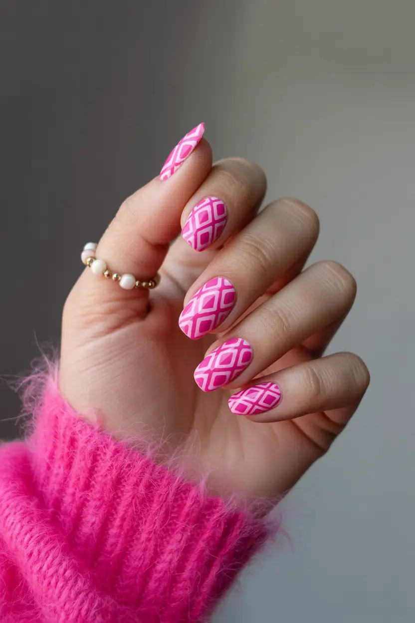 If I were recreating this manicure at home, I’d start with a strong hot pink gel polish like OPI Strawberry Margarita or Essie Gel Couture Rock the Runway. For the geometric overlay, a thin nail art brush and a lighter pink stamping polish work beautifully. Some nail artists I follow swear by The GelBottle nail art liners because they make crisp lines much easier – and honestly, precision matters with patterns like this.