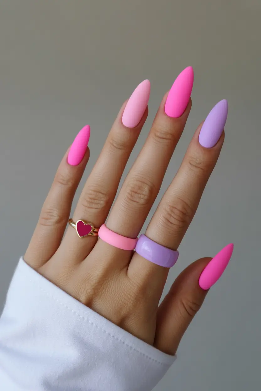 Matte Hot Pink and Lavender Stiletto Nails
