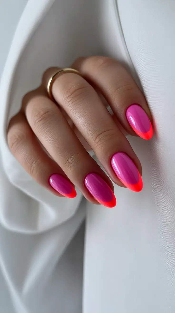 Sometimes the easiest way to make hot pink nails feel new for spring is to play with the tips. This almond manicure combines a glossy berry pink base with vibrant neon coral French edges. The gradient between the shades is soft, so the bright tips look modern rather than harsh. I love how the shape keeps the look elegant while the color adds that bold spring energy.