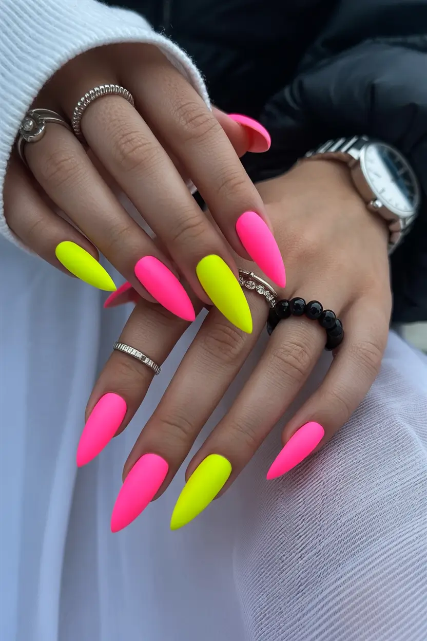 Matte Neon Pink and Yellow Almond Nails