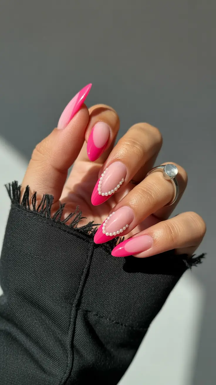There is something elegant about combining bold pink with delicate accents. This manicure features a classic almond shape with hot pink French tips over a soft milky nude base. Tiny pearl embellishments follow the curve of one nail, adding texture and a slightly romantic touch.