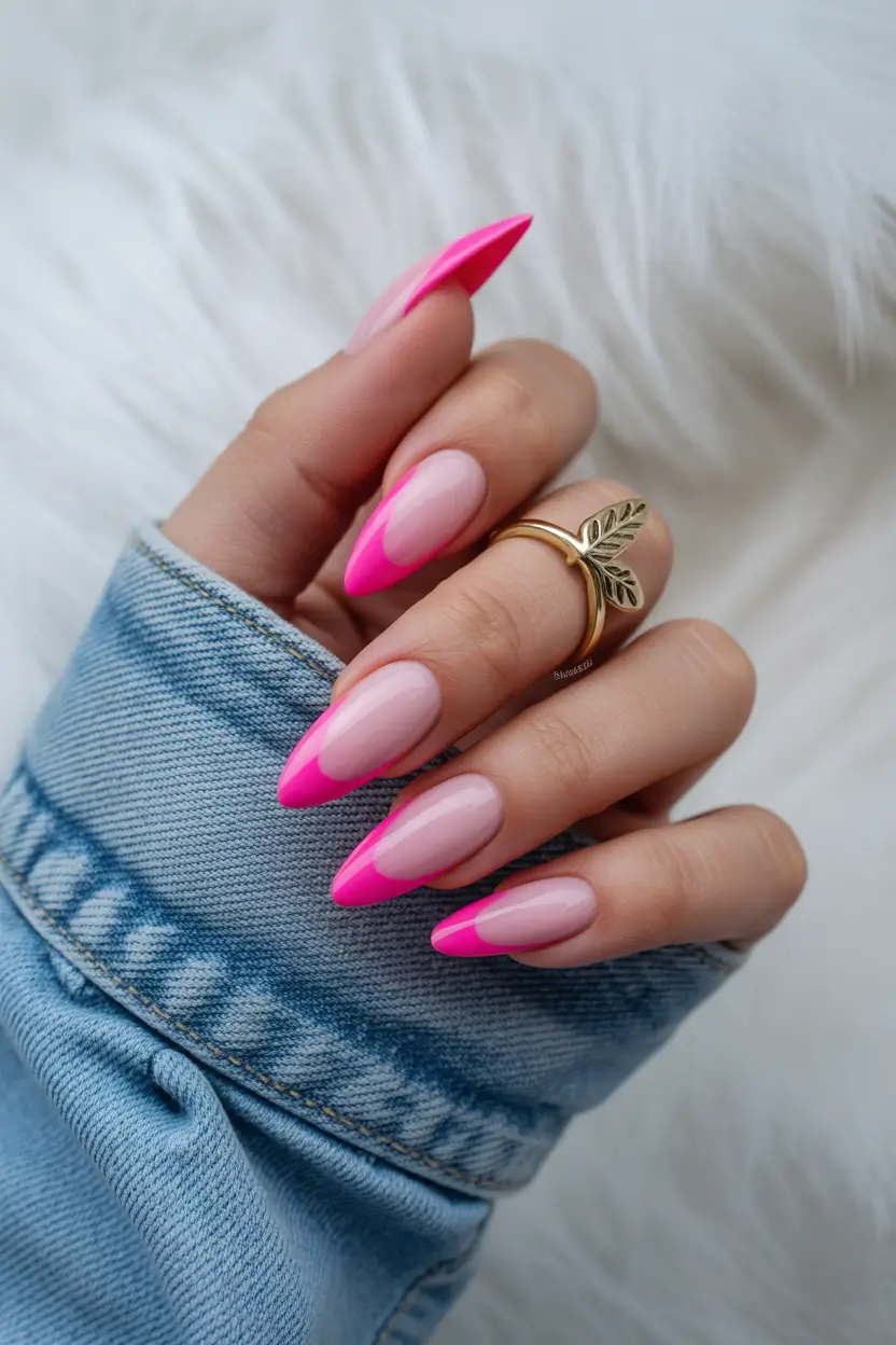 Sometimes the most beautiful spring manicure is also the simplest. This design focuses on clean almond shaped nails with a pale pink base and bold hot pink French tips. The contrast is crisp and polished, creating a timeless style that still feels very fresh.