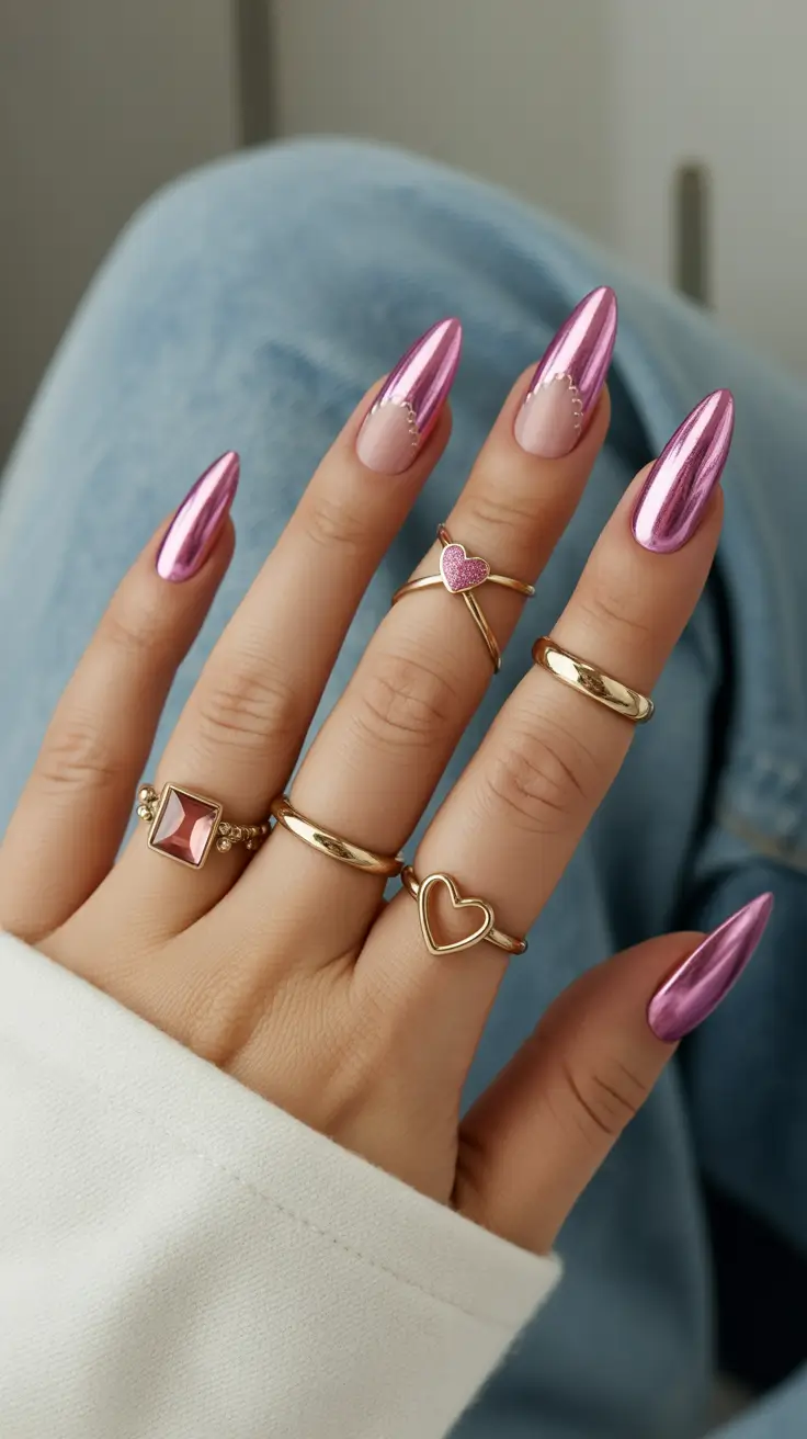 Chrome nails continue to dominate manicure trends, and this metallic pink version feels perfect for spring. The almond nails are coated in a reflective chrome powder that creates a mirror like surface in a rosy pink tone. The shine makes the manicure look futuristic but still feminine.