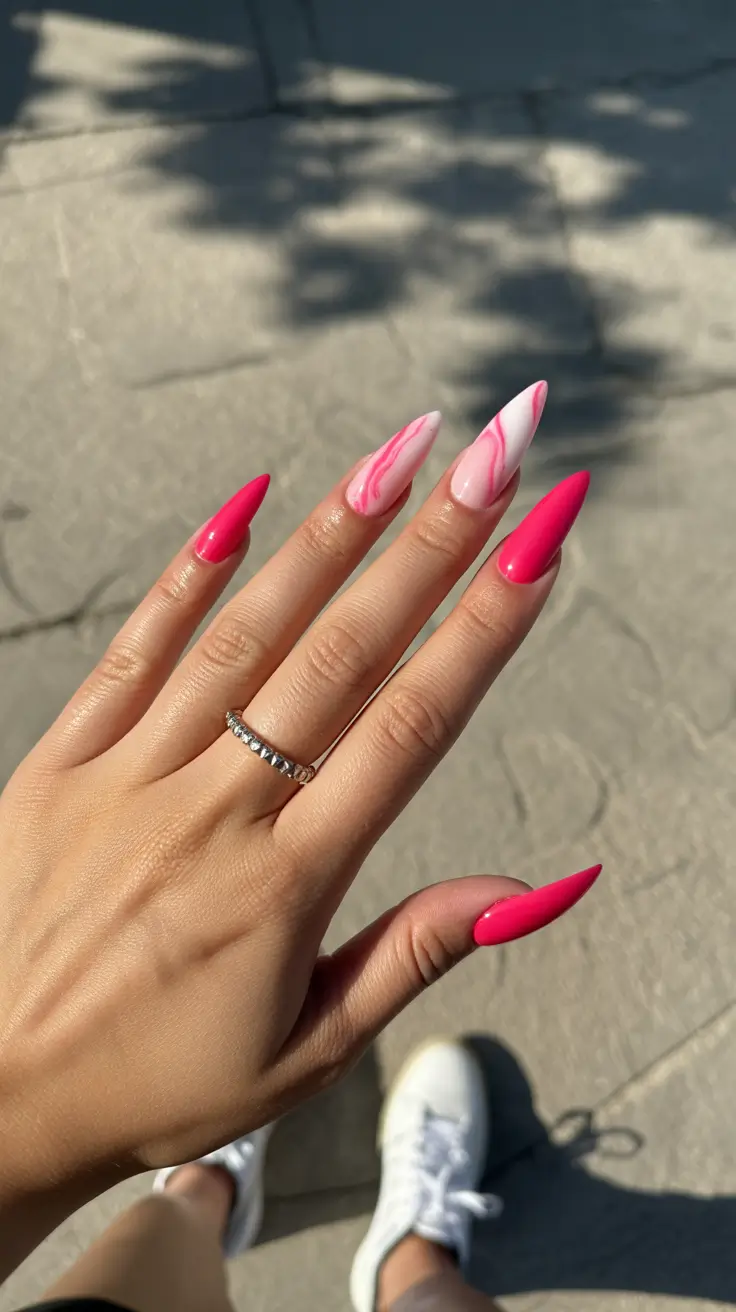 Every spring I get the urge to go longer with my nails – something about the extra sunlight makes dramatic shapes feel right. This almond design leans into that feeling with a vibrant hot pink polish paired with a soft marble swirl accent that almost melts across the nail. The shape elongates the fingers, and the glossy finish makes the pink look even brighter outdoors.
