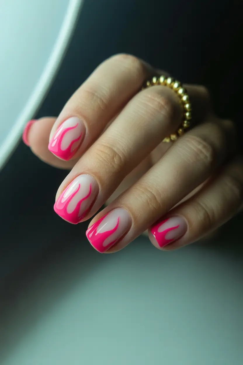 To recreate this style, I’d start with a milky nude gel base like OPI Bubble Bath or Bio Seaweed Milkshake. Once cured, a detail brush and a neon pink liner gel help create the flame shapes. The key is keeping the edges soft and slightly curved rather than perfectly symmetrical.