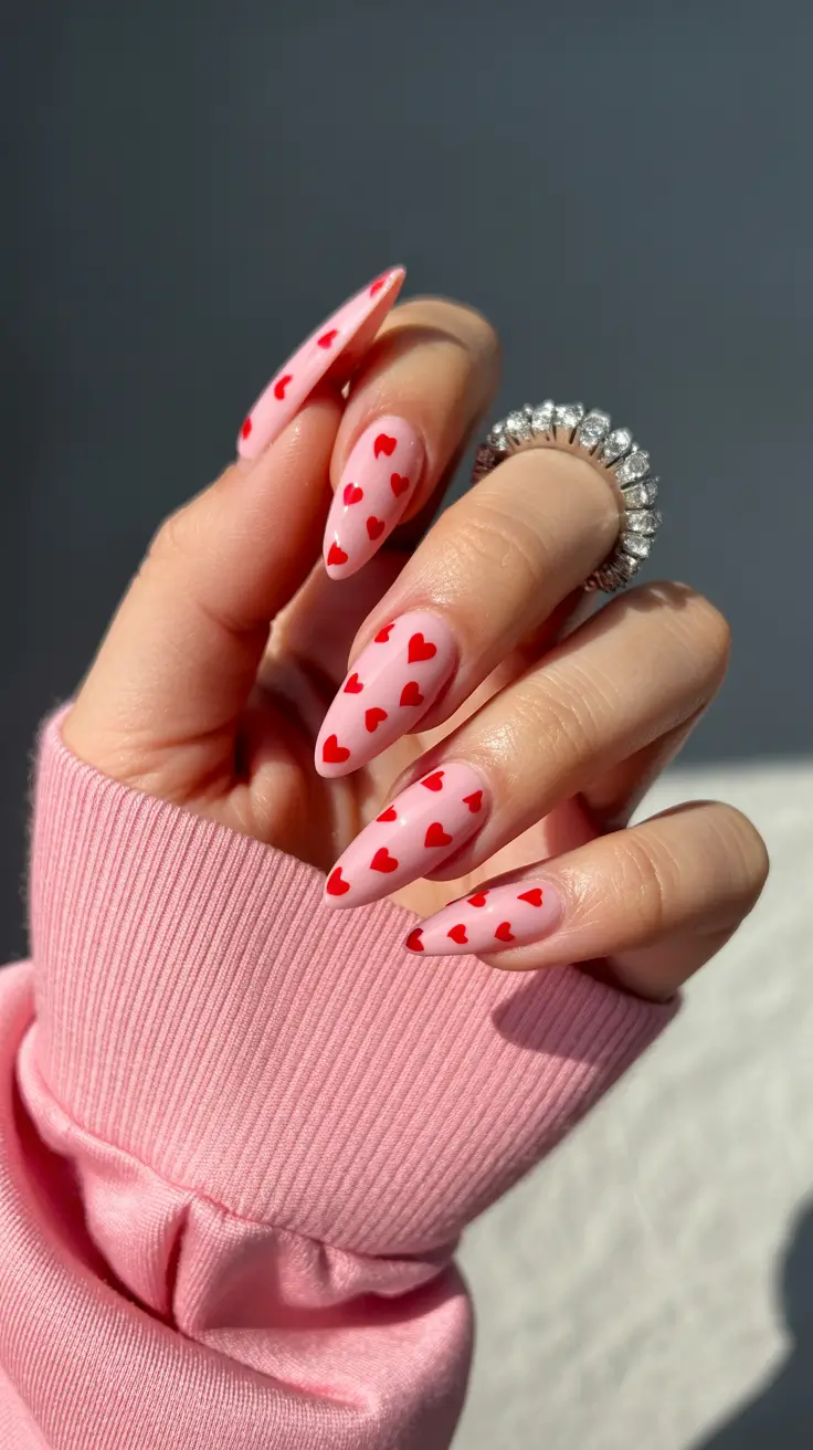 There’s something about tiny hearts on nails that never feels outdated. This almond-shaped manicure takes a delicate pink base and sprinkles it with small, vibrant red hearts, creating a design that feels sweet but still modern. The matte finish softens the look, giving the pattern a slightly velvety texture that’s perfect for spring.