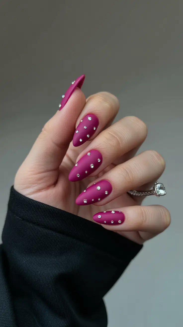 This manicure leans into elegance while still keeping that vibrant hot pink energy that defines spring nails in 2026. The almond shape elongates the fingers beautifully, while the matte raspberry pink finish gives the color a velvety softness. Small rhinestones scattered across each nail add a subtle sparkle that catches the light without overwhelming the design.