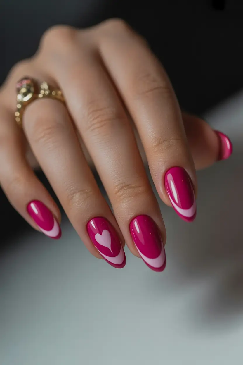 This manicure brings a romantic twist to classic French design. A glossy hot pink base covers most of the nails while a soft curved French accent in pale pink adds movement near the tips. One nail features a small heart detail that ties the whole design together in a subtle but charming way.