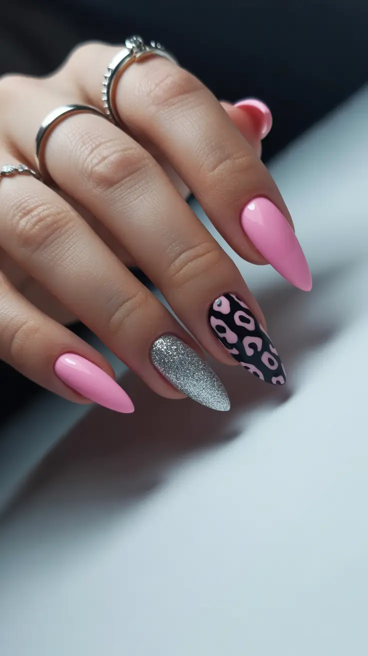 Some spring manicures mix softness with personality, and this one does exactly that. The design combines light baby pink almond nails with two accent nails – one covered in fine silver glitter and another featuring a black and pink leopard pattern. The contrast between delicate pink and bold animal print creates a fun but wearable nail idea.