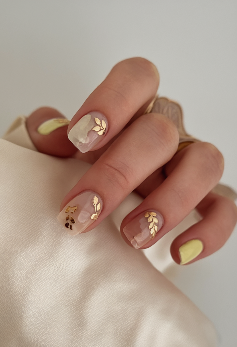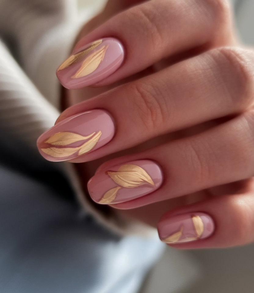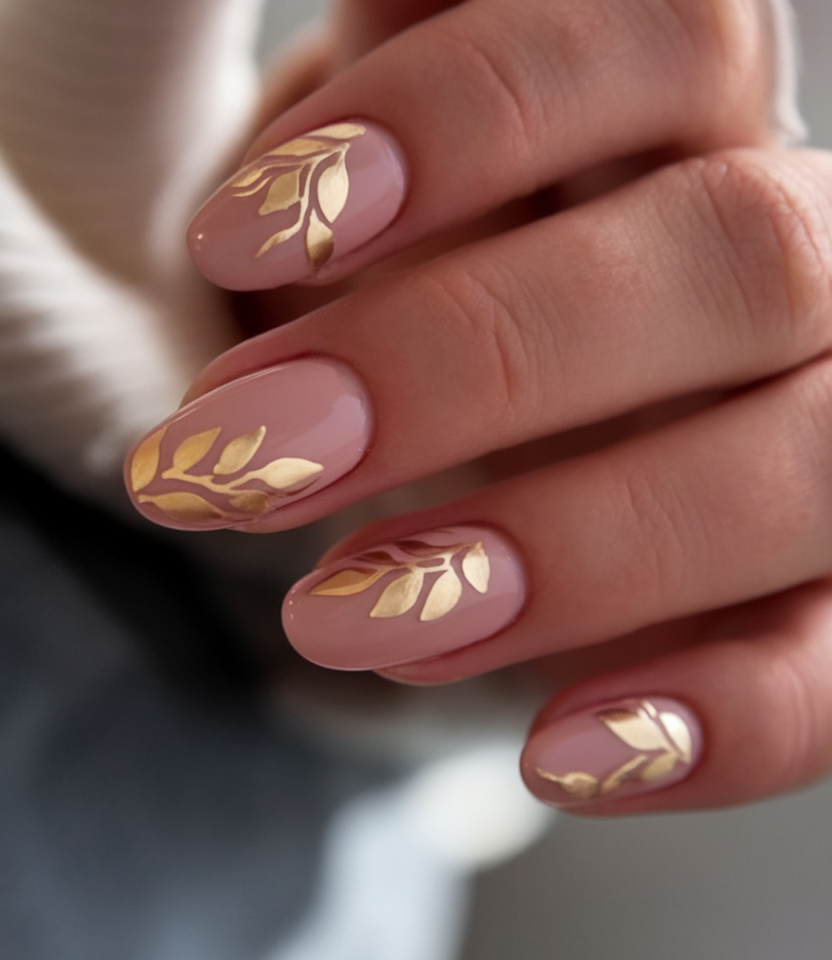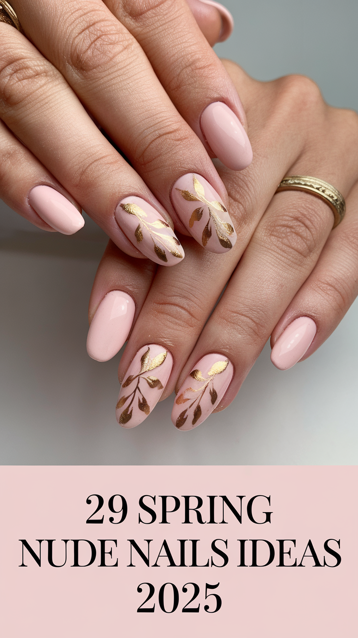 A refined spring nude nails ideas 2025 design, this manicure features a polish design with metallic gold leaf embellishments over a soft nude base. The short almond shape keeps the look natural and effortless while adding a hint of luxury. The intricate leaf patterns provide a modern botanical feel, making this an ideal colors design for those who love nature-inspired aesthetics. The balance of soft neutrals and metallic details creates a perfect blend of subtle and statement.