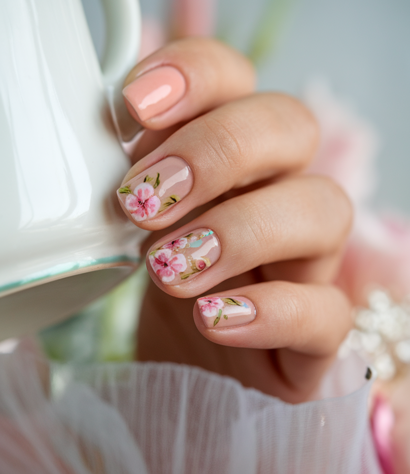 This spring nude nails ideas 2025 look combines a delicate nude base with hand-painted floral details. The soft pink tones blend seamlessly into the natural nail, while the intricate flowers add a fresh and elegant touch. This polish design is perfect for those who love romantic styles with a bit of artistic flair. The short almond shape keeps the nails practical yet stylish, ideal for both casual and formal settings.