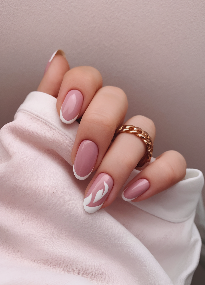 A modern take on colors French, this French tip design pairs a muted pink and nude base with crisp white tips. The abstract swirls add a contemporary touch, making it a fresh update on the classic polish design. The short almond shape enhances the elegance of the manicure while keeping it practical. This look is perfect for those who love a minimalist yet creative approach to nail art.