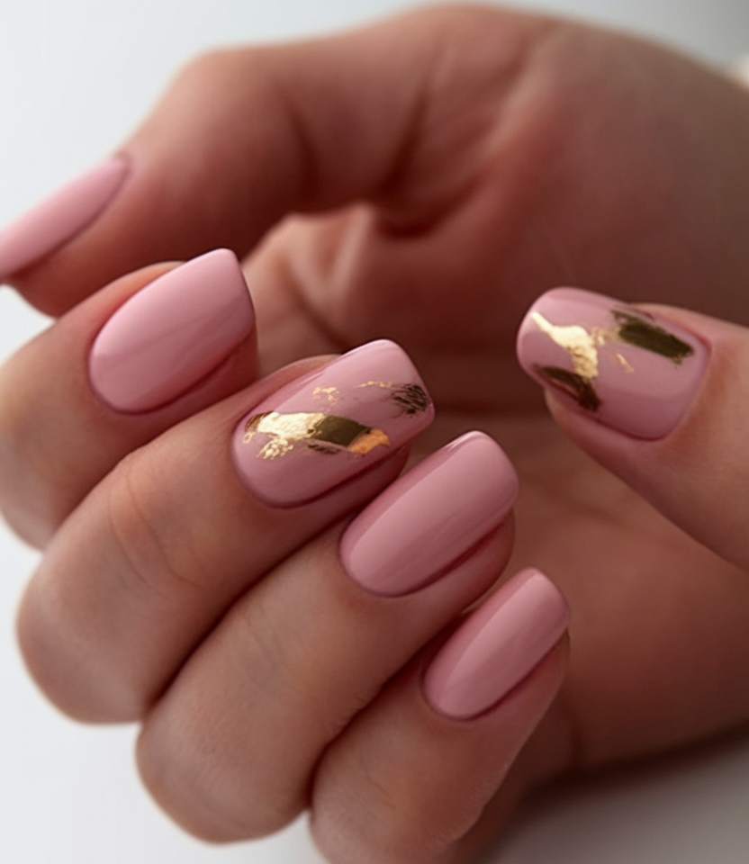 A timeless polish design, this manicure features a warm pink and nude base with delicate gold leaf accents. The short almond shape keeps the look elegant yet wearable, making it ideal for everyday or special occasions. The gold embellishments add a touch of sophistication while keeping the colors design modern and fresh. This simple yet eye-catching style blends soft tones with metallic elegance.
