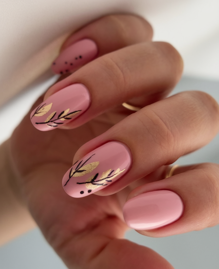 A unique blend of black and gold detailing, this polish design features delicate leaf patterns over a soft pink base. The combination of gold accents with fine black lines creates an artistic yet balanced look. The short almond shape adds to the modern aesthetic, making this style perfect for those who love intricate yet wearable designs. This colors design is a perfect mix of elegance and creativity for spring.