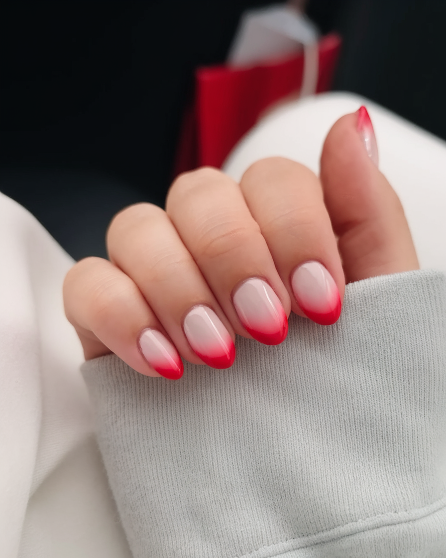 This colors French manicure features a seamless polish design transitioning from a soft nude base to bold red tips. The short almond shape keeps the nails delicate and refined while making the gradient stand out. The smooth blending of color gives a modern twist to the French tip, making it an eye-catching yet wearable style. This simple yet bold design is perfect for those who love classic manicures with a fresh update.