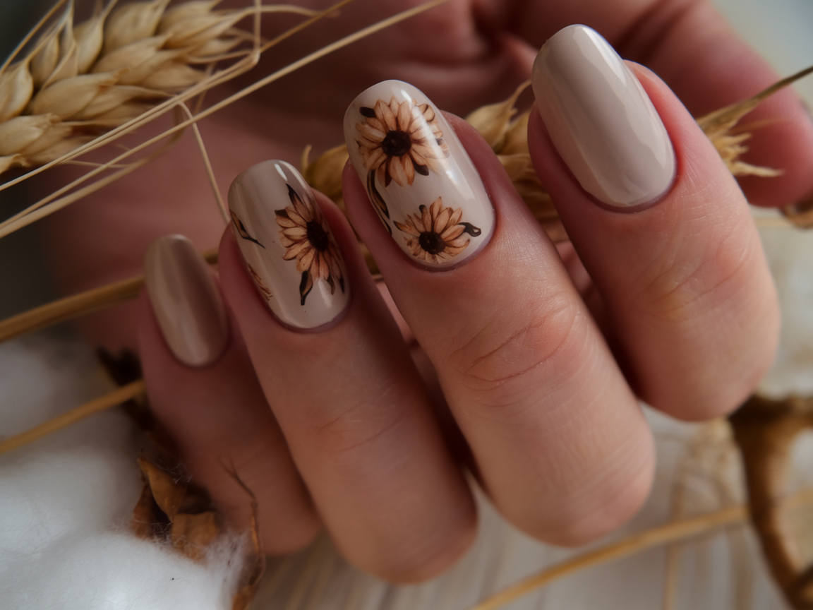A stunning spring nude nails ideas 2025 look, this manicure pairs a warm brown nude base with intricate sunflower designs. The delicate hand-painted floral details add a rustic, nature-inspired feel, making it a perfect choice for spring. The polish design is balanced between solid nails and detailed accent nails, creating a soft yet artistic effect. The short length enhances practicality while maintaining an elegant, polished finish.