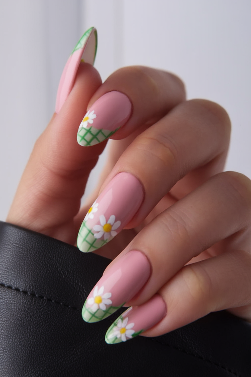 A playful colors French design, this stiletto manicure features a soft pink and nude base with vibrant green French tips. The white daisy accents add a fresh spring touch, making the polish design feel bright and cheerful. The combination of geometric grid patterns with floral elements creates a unique balance of structure and softness. This bold colors design is perfect for those who love statement nails with a fun, seasonal twist.