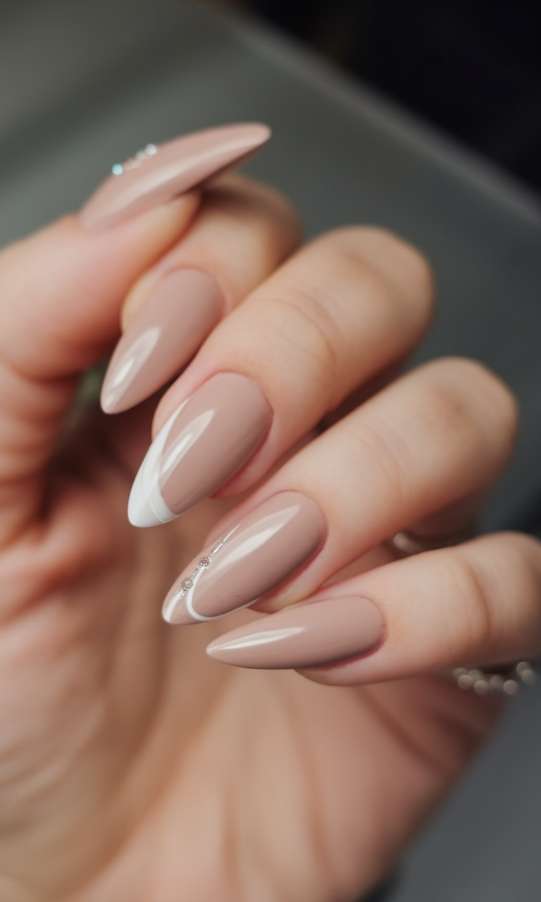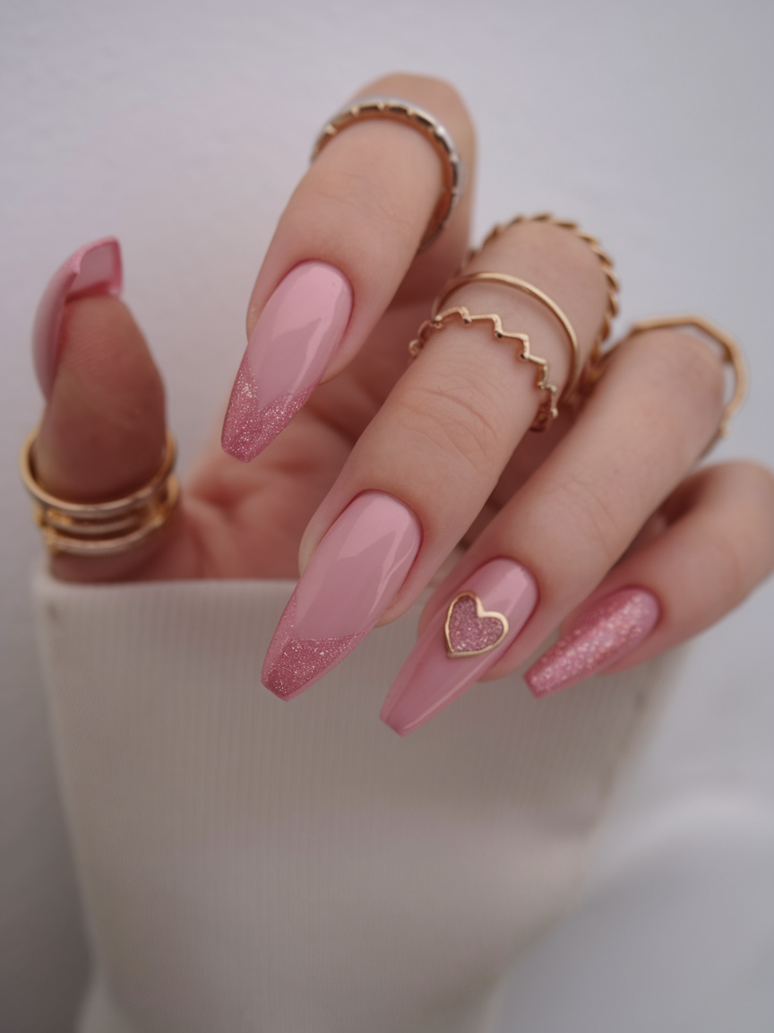 This spring nude nails ideas 2025 design features a delicate pink and nude base with shimmering glitter French tips. The stiletto shape elongates the fingers, giving a sleek and sophisticated feel. A gold-framed heart accent adds a romantic and elegant touch, making this polish design perfect for special occasions. The balance of glossy and glitter textures keeps the look modern and eye-catching.