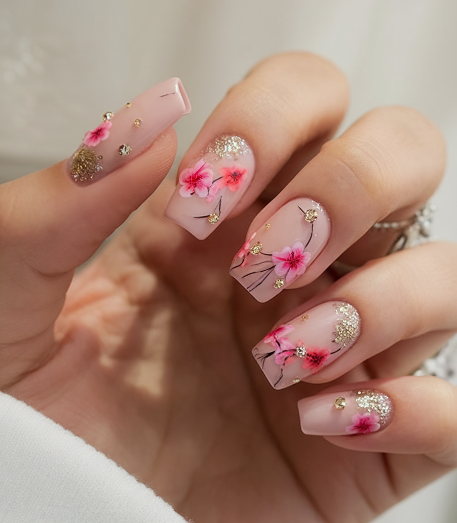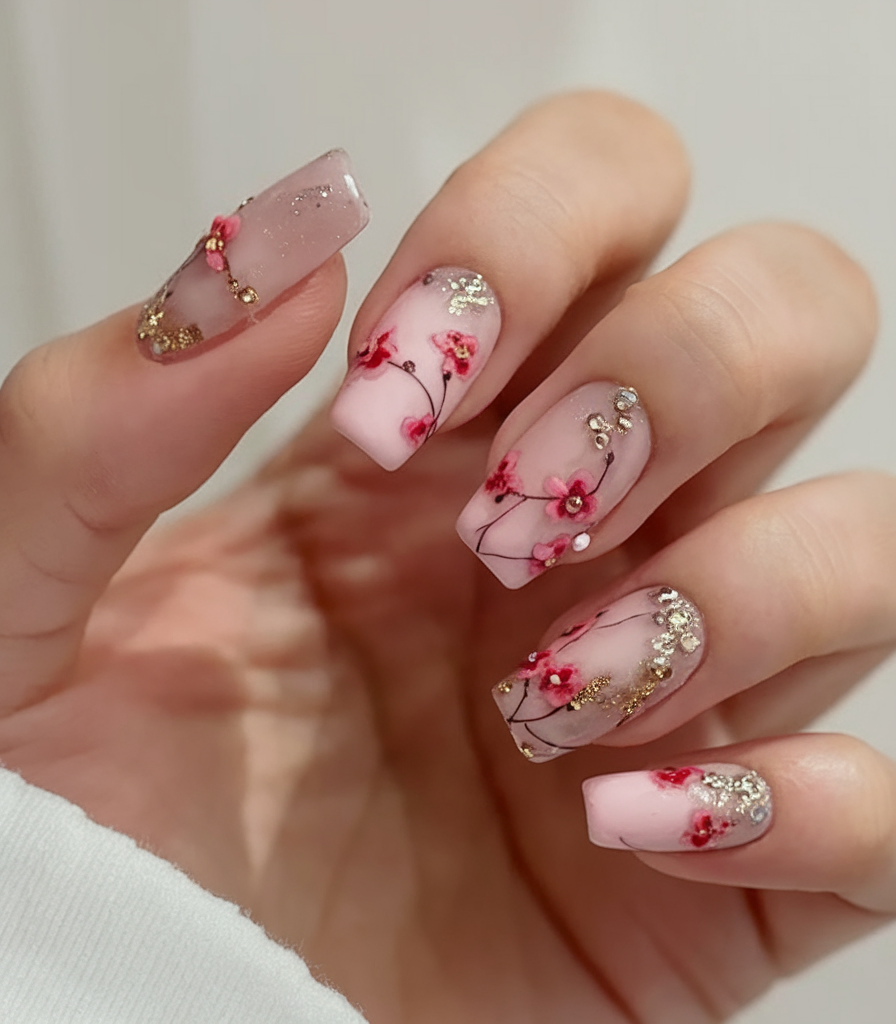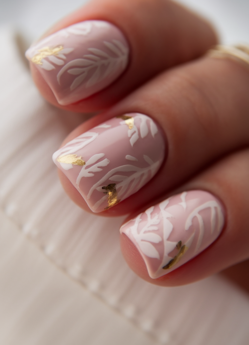 This set embraces soft pink tones with a matte finish, featuring white floral patterns delicately painted across the nails. The leafy designs are highlighted with touches of gold foil, creating a refined and artistic feel. The square shape enhances the modern, structured look, while the soft detailing keeps it feminine and fresh. This manicure is ideal for those who love timeless, nature-inspired designs with a hint of glamour.
