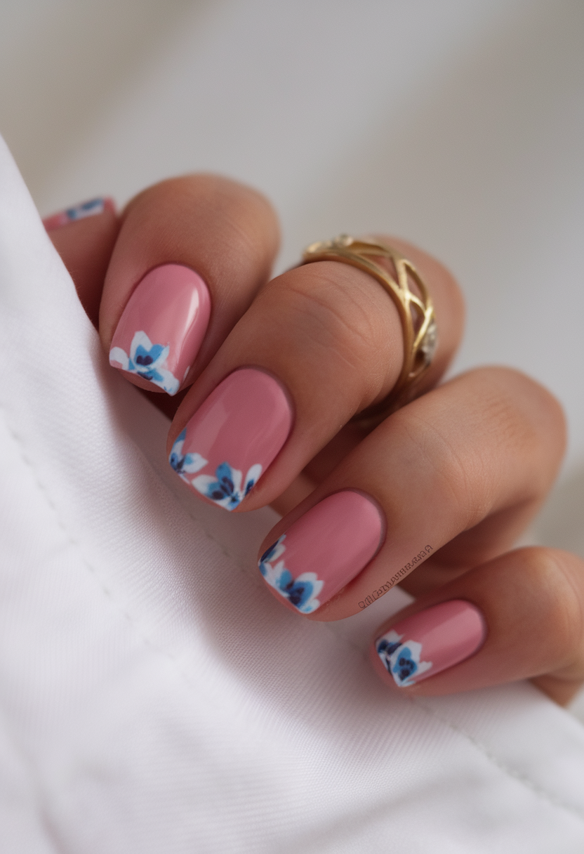 A fresh take on colors French, this polish design features a short square shape with a soft pink base and blue floral accents. The carefully painted petals add a pop of color while keeping the overall look elegant and wearable. The floral details at the tips create a French tip effect, making the manicure both delicate and stylish. This simple yet artistic style is perfect for adding a bit of spring vibrancy to everyday nails.