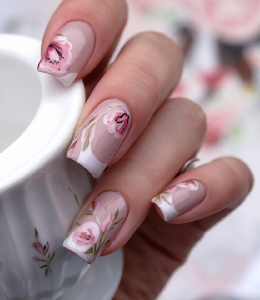 A modern twist on the colors French manicure, this French tip design features a soft pink and nude base paired with delicate hand-painted flowers. The classic acrylic style is elevated with an elegant curve that enhances the natural length of the nails. This polish design is both refined and feminine, making it a perfect choice for spring. The balance between color and negative space creates a sophisticated, airy aesthetic.