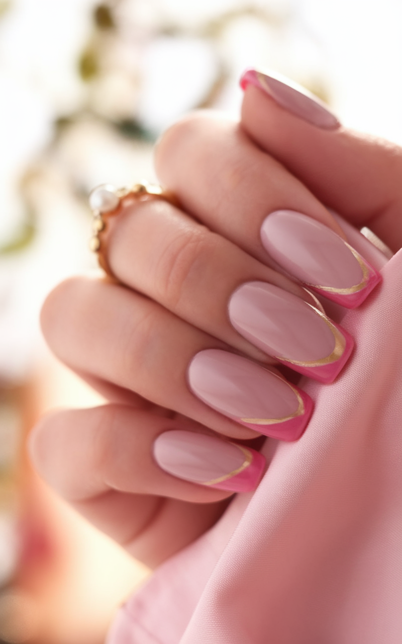 A chic colors French manicure, this design combines a soft nude pink and blush base with striking gold and fuchsia accents. The curved French tip detailing adds dimension, making the nails appear longer and more sculpted. The acrylic square shape gives a polished and structured look, perfect for an elevated take on classic nail art. This polish design is a luxurious blend of subtle elegance and bold style.