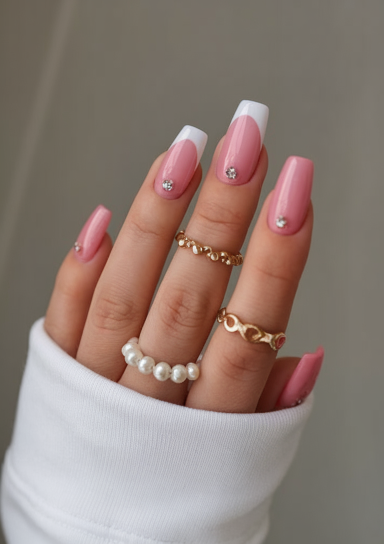 This modern take on a French manicure blends classic elegance with a fresh, trendy approach. The square-shaped nails are painted in a soft pink shade, with crisp white tips that follow a deep, curved contour. Small rhinestones at the base of each nail add a subtle yet glamorous touch, making the design ideal for special occasions or everyday wear with a bit of sparkle. The glossy topcoat ensures durability and a luxurious shine.