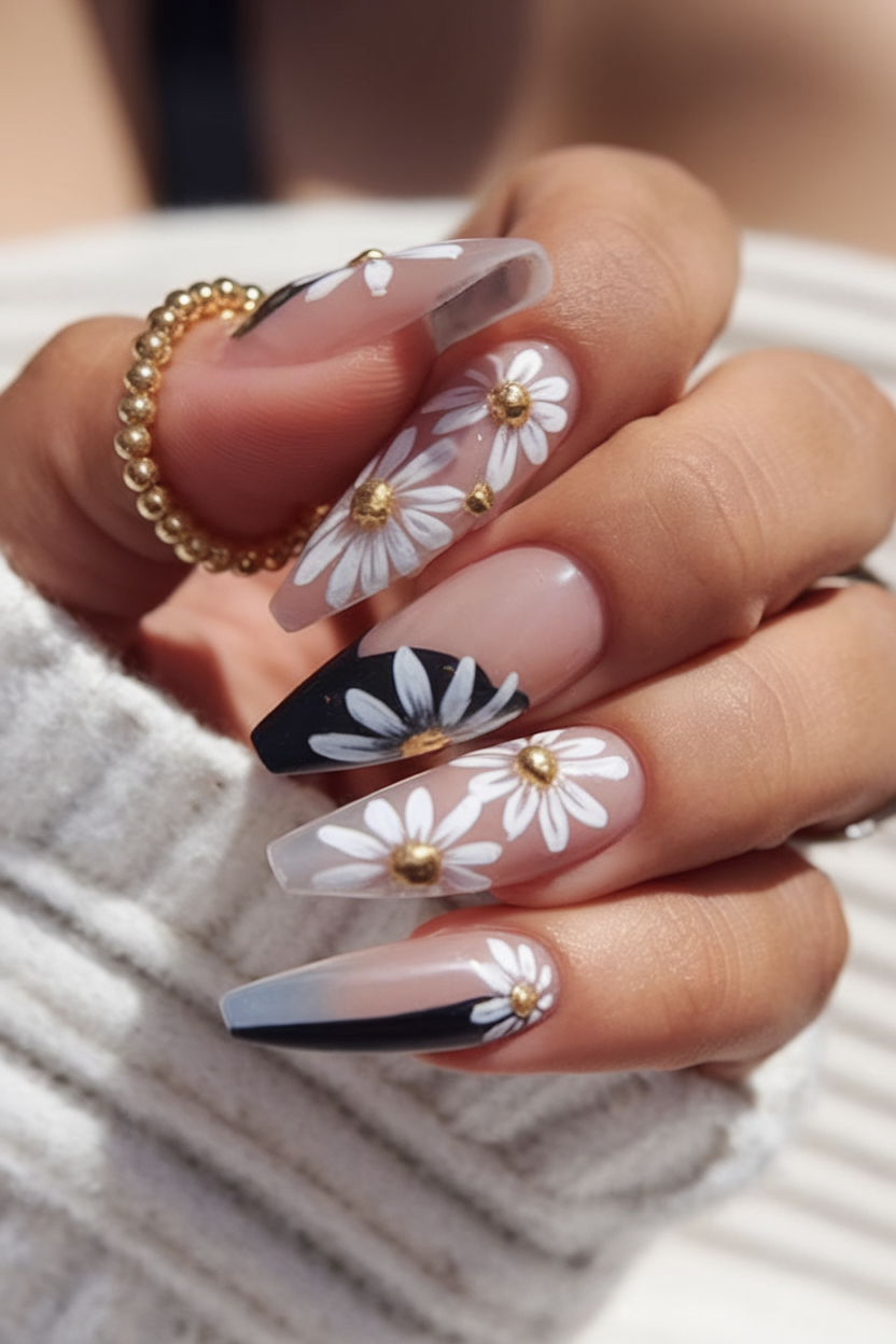 This striking daisy-themed manicure combines a bold black-and-white contrast with delicate floral artistry. The clear and nude base serves as a canvas for the hand-painted daisies, each featuring crisp white petals and a golden center. Alternating nails showcase sleek black tips that add a modern edge to the otherwise soft and romantic design. The long, almond shape enhances the elegance, making this a standout choice for those who love a mix of bold and feminine aesthetics.