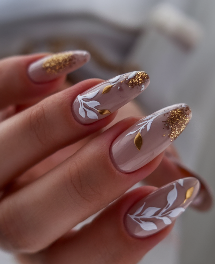 A sophisticated mix of warm nude tones and gold embellishments gives these nails a refined, luxurious look. The almond-shaped design features a muted beige base, adorned with delicate white leaf patterns and gold foil accents. The subtle gradient effect on some nails, transitioning from soft nude to glittering gold, adds a glamorous yet understated dimension. This combination of fine detailing and metallic shimmer makes it a perfect choice for an effortlessly chic aesthetic.