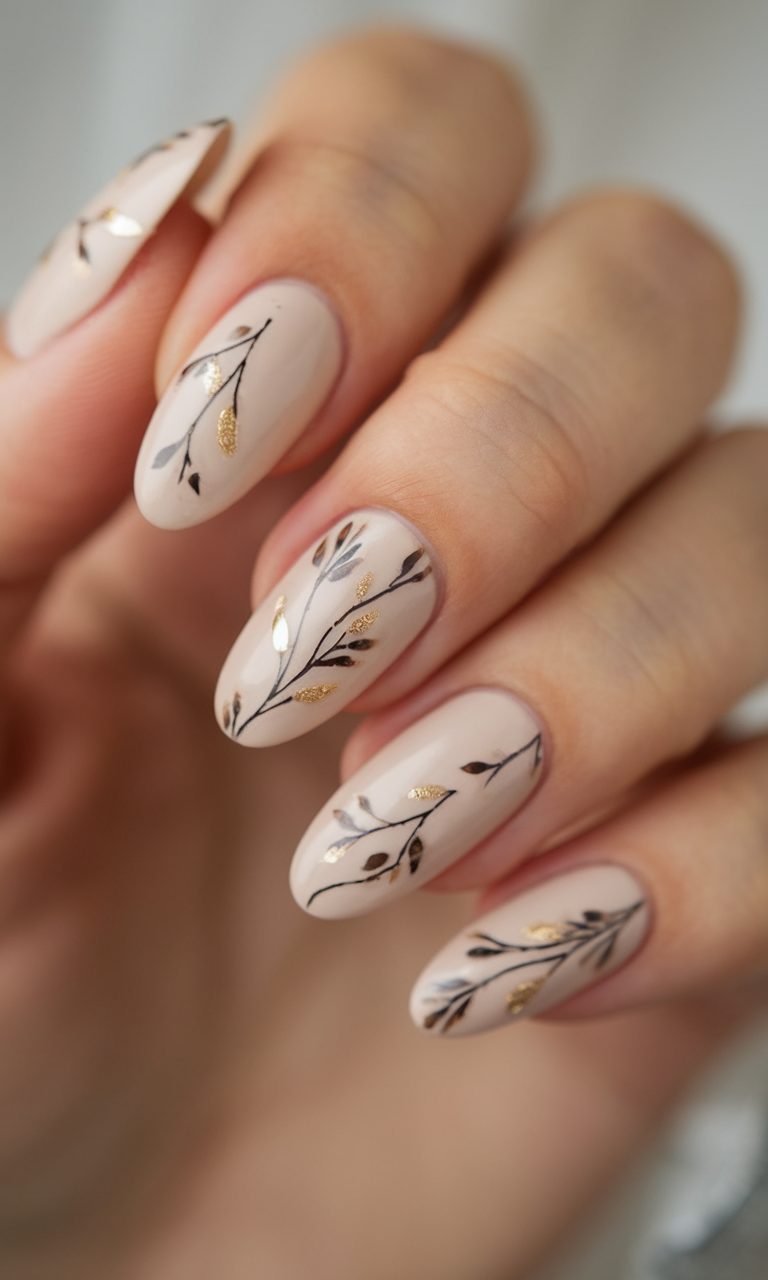 A soft, milky nude base serves as the perfect canvas for these intricate botanical details. Thin black stems extend across each nail, with small golden leaves adding a refined touch. The hand-painted branches create a delicate, natural flow, making this manicure an elegant option for those who appreciate subtle yet artistic nail designs. The contrast of the black and gold detailing against the neutral base keeps the look balanced and sophisticated.