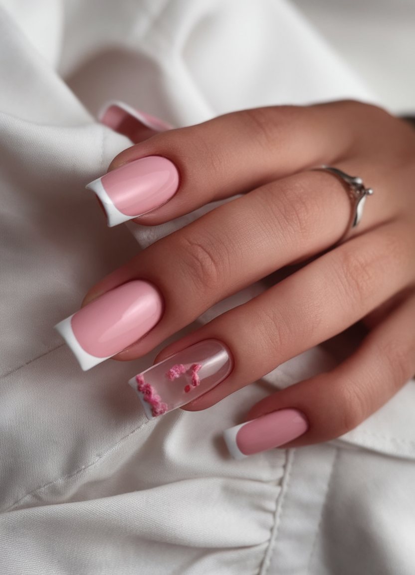 A refined take on the French manicure, this set pairs soft pink nails with bold white tips for a polished, timeless look. The accent nail stands out with a transparent base adorned with a 3D floral embroidery effect, adding depth and texture. The square shape enhances the structured yet feminine appeal, making this a chic and versatile choice for everyday wear or special occasions.