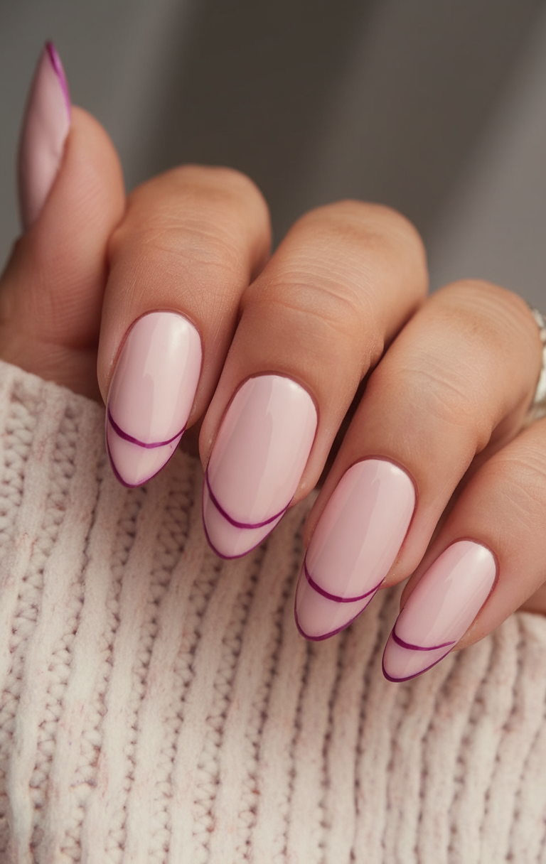 A chic and simple take on spring nude nails ideas 2025, this design features a soft nude base with sleek purple edge accents. The short almond shape keeps the look refined, while the contrast between the neutral tone and deep colors design makes it modern. This polish choice is perfect for those who want a subtle yet eye-catching manicure without overwhelming details.