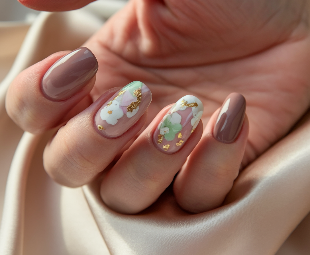 This elegant spring nude nails ideas 2025 look blends a muted brown base with delicate floral accents. The gold foil details add a luxurious touch, while the soft green and pastel flowers create a fresh spring vibe. The combination of solid color and intricate design makes this polish design ideal for those who love nature-inspired manicures. The short almond shape enhances the overall refined and modern aesthetic.