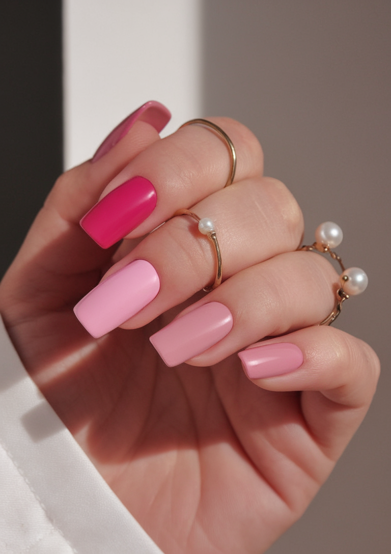A bold yet sophisticated take on colors design, this pink and nude gradient manicure is perfect for spring. The smooth transition from soft blush to deep magenta gives a chic and playful effect. The acrylic square shape enhances the sleekness of the polish, making it a statement look. This simple yet striking style is perfect for those who love a fresh, modern manicure.