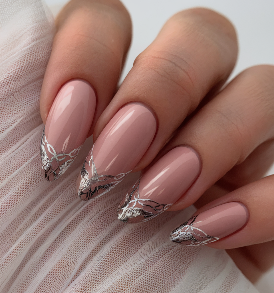 This spring nude nails ideas 2025 design combines a soft pink base with intricate silver leaf accents. The stiletto shape enhances the elegance of the look, while the metallic details give a refined, luxurious effect. The polish design is perfect for those who want a balance between minimalism and artistry. The organic silver embellishments add dimension without overwhelming the subtle pink and nude tones.