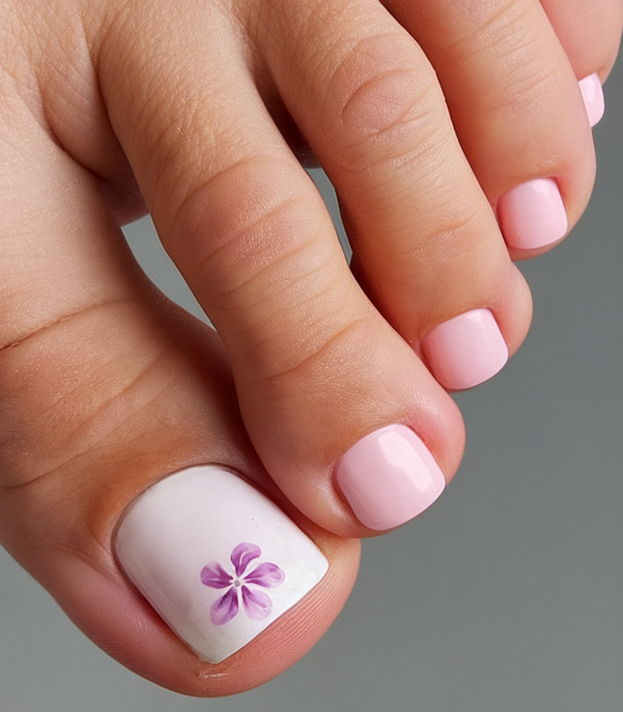 A clean and easy big design, this look features a soft pink gel base with a delicate simple butterfly-style floral accent on the big toe. The crisp white background enhances the hand-painted purple flower, giving the design a polished and refined touch. This minimalist approach is perfect for those who love a subtle yet trendy Y2K aesthetic.