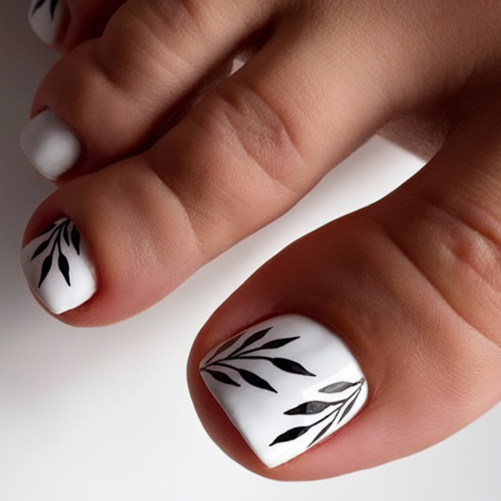 A sleek and modern take on black and white nail art, this pedicure features a crisp white gel base with thin black leaf details. The fine lines create a sophisticated, aesthetic effect, making it a stylish choice for any occasion. The high-shine gel finish ensures a polished look while keeping the design effortlessly chic.