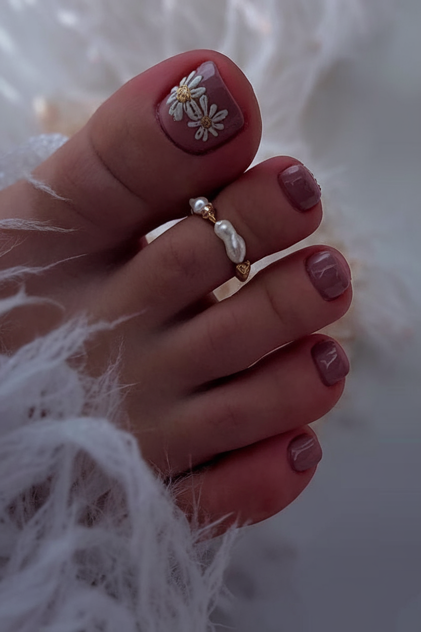 For a soft and bridal-inspired look, this pedicure features a muted brown gel base adorned with hand-painted white daisies. The delicate floral elements are enhanced with tiny gold centers, adding a sophisticated touch. This design is a perfect beginner-friendly option for those who love floral details with a neutral-toned elegance.