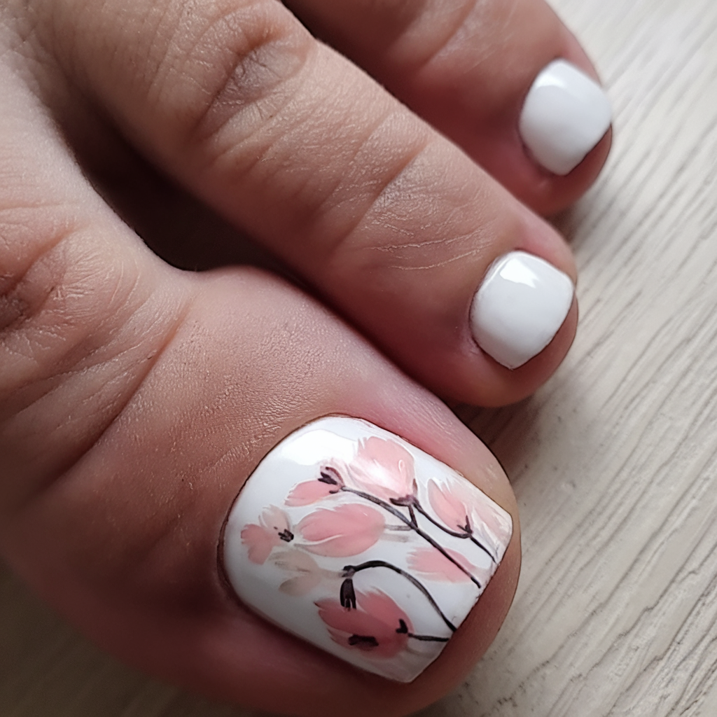 This bridal-inspired design features a white gel base with delicate hand-painted pink flowers on the big toe. The soft floral strokes create an elegant, blooming gel effect, adding a natural yet refined touch. The remaining toes maintain a clean white finish, making this pedicure perfect for spring weddings or romantic occasions.