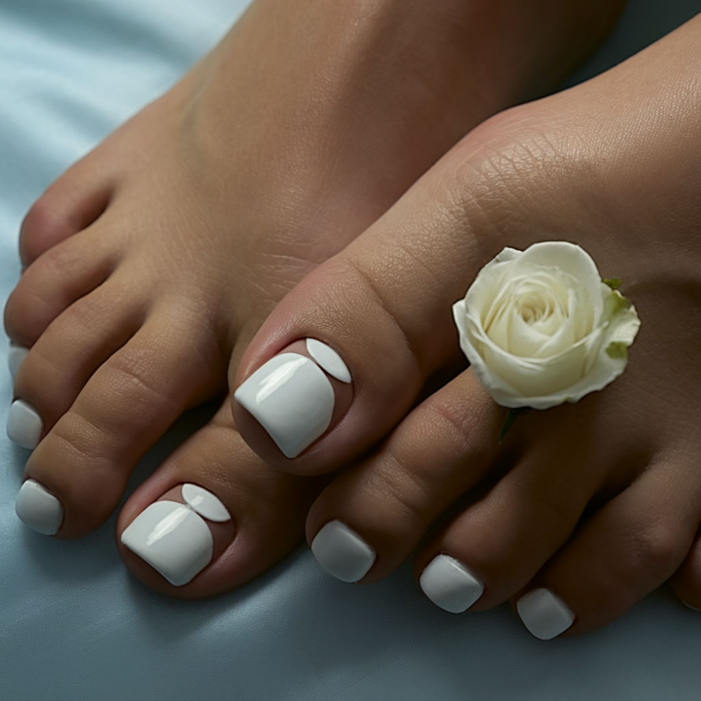 For those who love a simple yet aesthetic style, this white gel pedicure is an ideal choice. The design features subtle petal-shaped accents on select toes, adding a modern and bridal flair. The high-shine gel finish keeps the look polished and sophisticated, making it a beginner-friendly yet chic option.