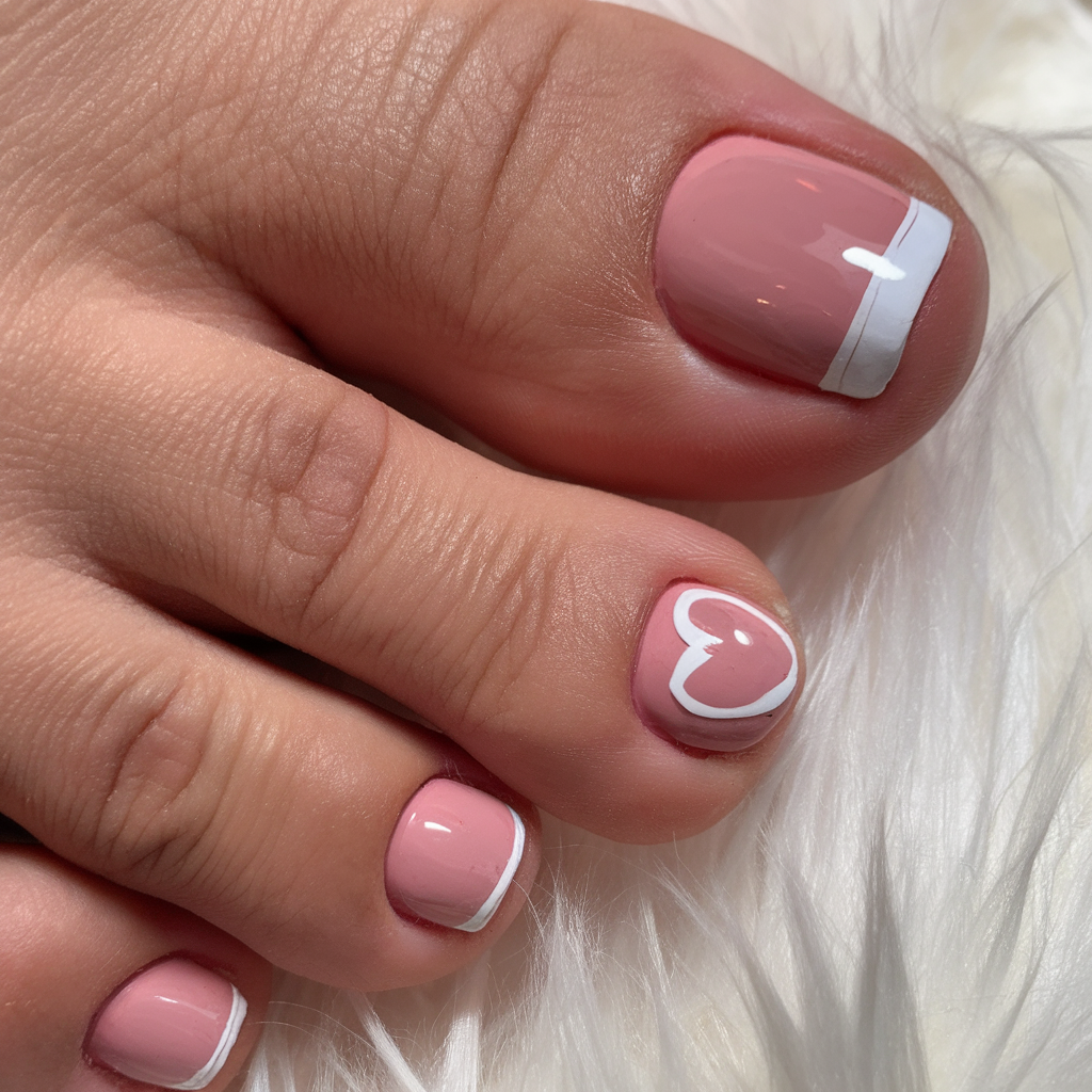 This romantic and bridal-inspired design showcases a soft pink gel base with classic white French tips. A dainty white heart accent on one toe adds a touch of charm, making this an easy big yet elegant choice. The smooth gel finish enhances the glossy effect, perfect for a beginner-friendly yet stylish pedicure.