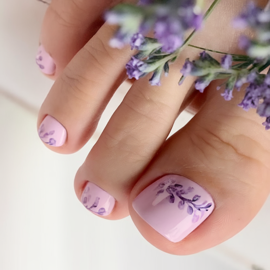 A delicate blooming gel floral design, this pedicure features a pastel pink gel base adorned with hand-painted lavender sprigs. The soft aesthetic of the floral elements adds a bridal and nature-inspired touch. This design is ideal for those who prefer matching their pedicure with a subtle yet artistic look.