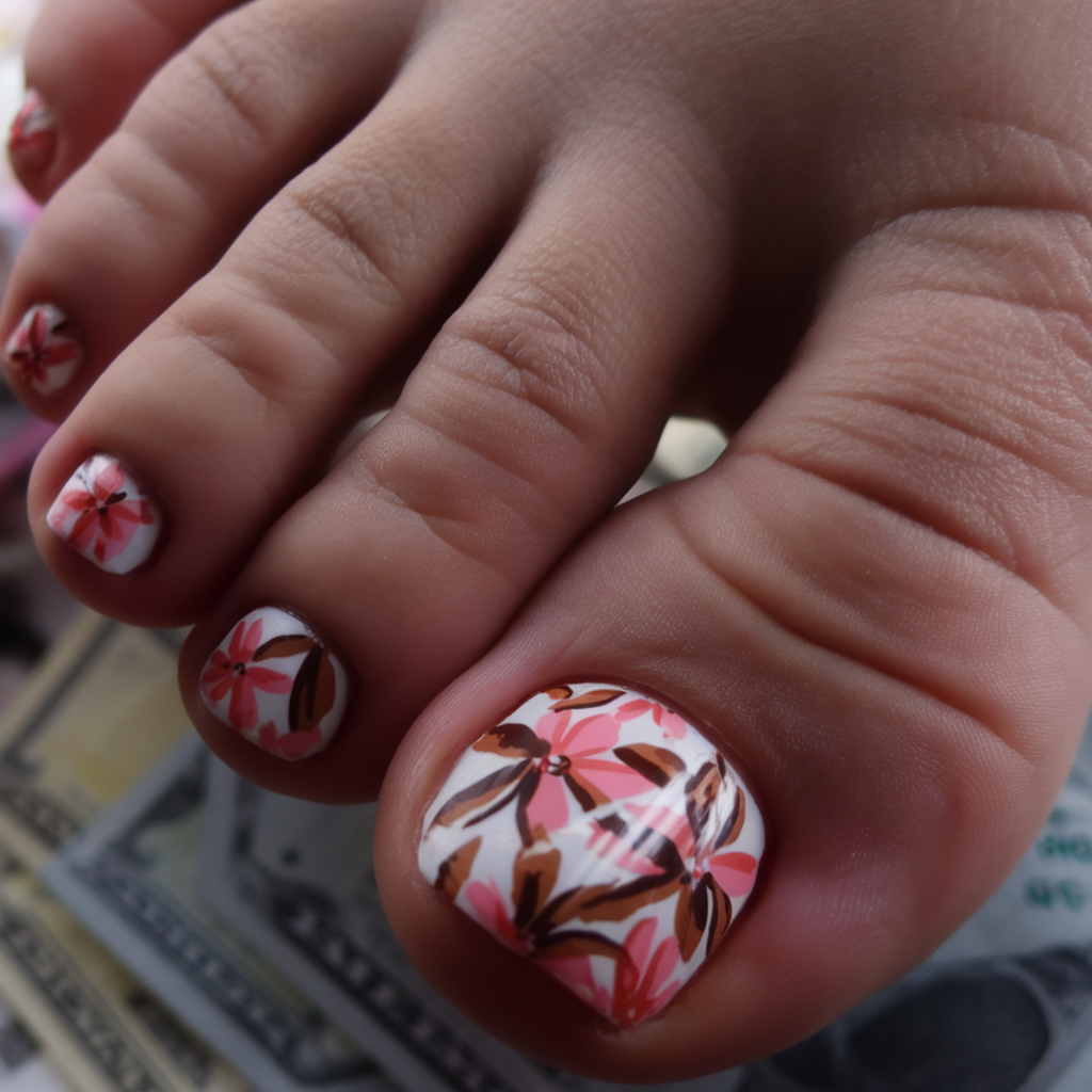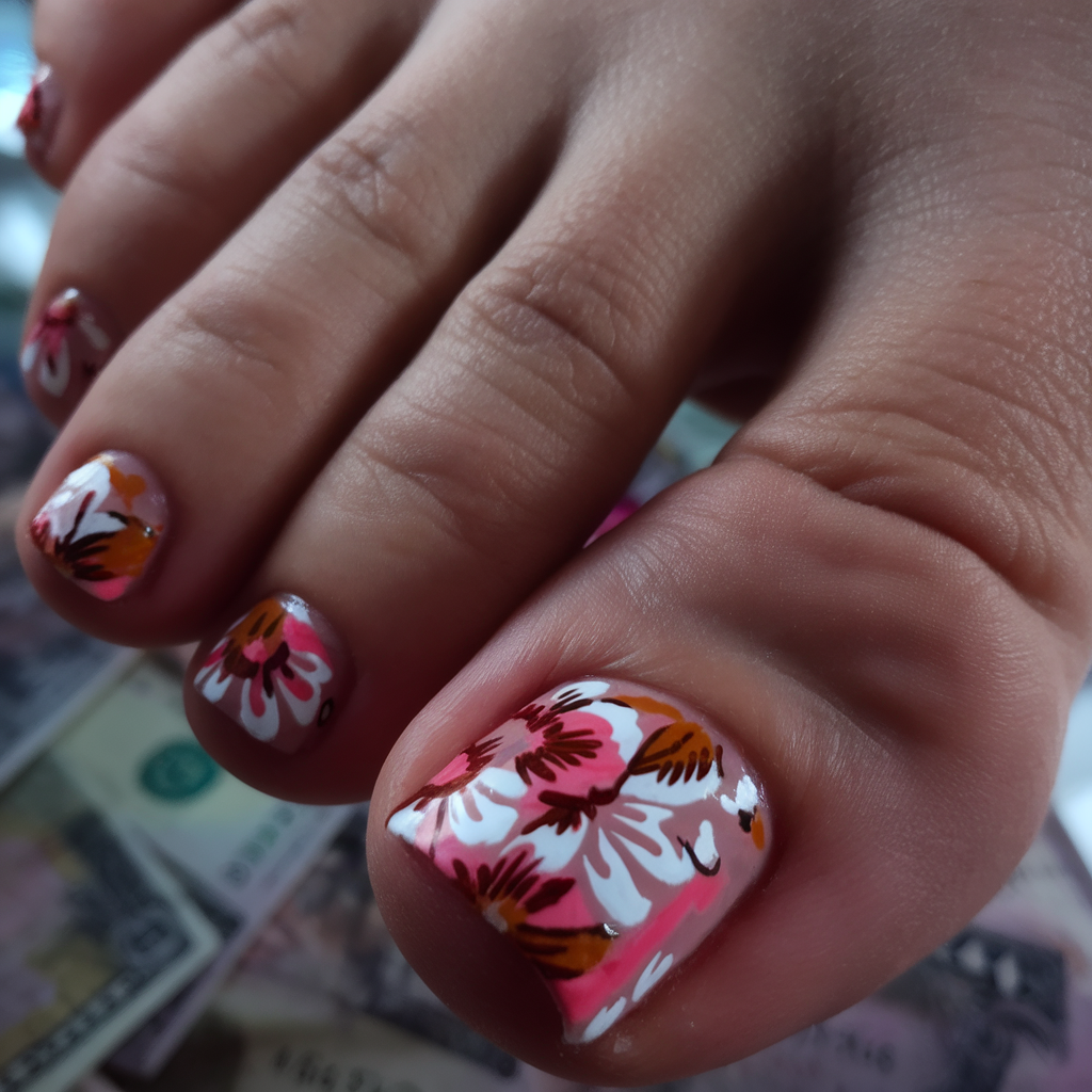 This easy big design features a bright pink gel base adorned with detailed white and brown floral accents. The blooming gel effect adds depth, making the flowers look hand-painted and delicate. This pedicure is perfect for those who love a matching, lively spring-inspired look.