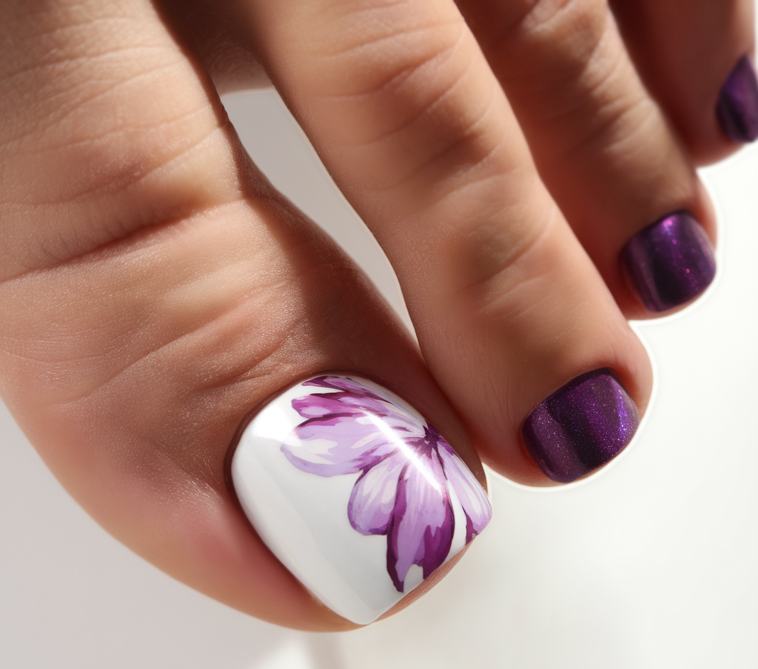 This black and white contrast pedicure combines a crisp white base on the big toe with a hand-painted blooming gel purple flower. The rest of the toes are coated in a cat eye-effect deep purple, adding a luxurious and modern touch. This design blends acrylic-like precision with a bridal elegance.