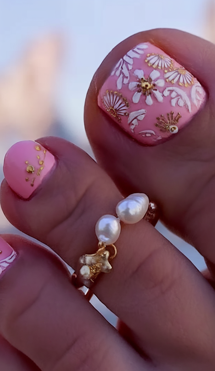 A soft pink base with intricate gold floral details makes this blooming gel design perfect for bridal and elegant occasions. The gold accents add a chrome shimmer, creating a sophisticated yet aesthetic effect. This pedicure pairs beautifully with matching accessories for a cohesive and glamorous look.