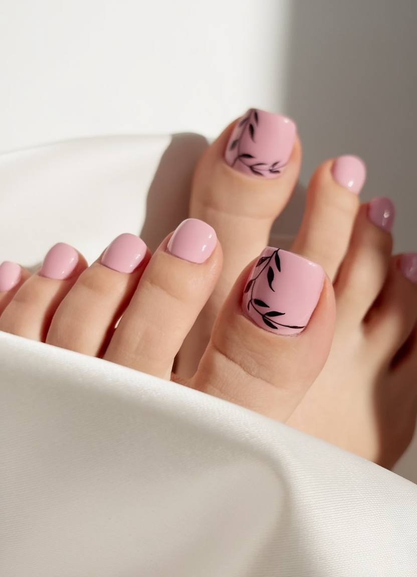 For a more aesthetic and understated approach, this matching pedicure features a soft pink gel base with delicate black and white leaf accents on the big toe. The contrast between the gentle pastel tone and the dark details creates a stylish beginner-friendly look. Its simplicity makes it perfect for everyday wear, while the subtle art keeps it trendy and unique.