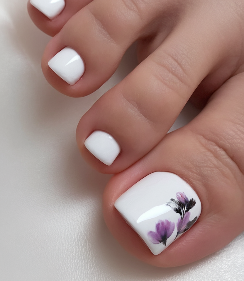 A dreamy blend of lavender and white, this design highlights hand-painted floral art for a sophisticated acrylic-like effect. The detailed flowers on the big toe add an elegant, nature-inspired touch, while the glossy gel finish enhances the overall look. This pedicure is perfect for those looking for a mix of bridal sophistication and modern inspo for the season.