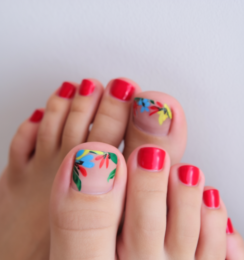 For those who love a vibrant, easy big statement, this red pedicure is the perfect choice. The big toe features a clear base with a blooming gel floral design in blue, yellow, and green, adding a lively pop of color. The solid gel red polish on the remaining nails creates a bold contrast, making this look fun, trendy, and perfect for warmer days.